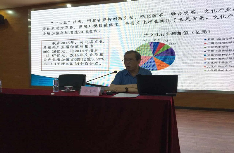 之后,李建华厅长做了题为《河北文化产业发展前景》的专题讲座。他从我省文化产业发展现状、问题和挑战、优势与机遇、文化产业发展“十三五”规划、京津冀文化产业协同发展五个方面进行了深入分析。李厅长指出,2022年京张冬奥会的成功申办和雄安新区的设立,既为我省文化产业的发展带来了史无前例的机遇,也带来了创新协同发展体制机制的挑战。京津冀文化产业研究所要抓住机遇,探索出突破三地协同发展难题的路径方法。吴国英院长对讲座做了精彩点评。