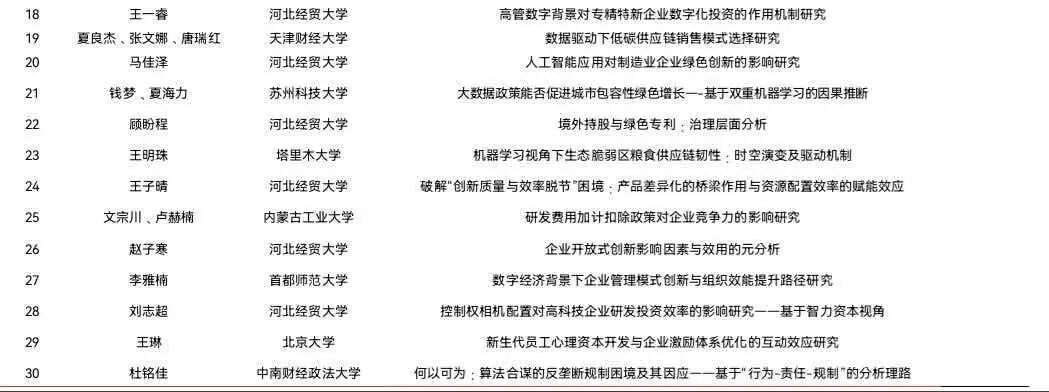 本次论坛自发布公告起,共收到来自北京大学、南开大学、国防科技大学、中国政法大学、中南财经政法大学、首都师范大学、天津财经大学、西南科技大学等29所高校的共计53篇投稿。经专家评审和专业评审团队讨论,确定论坛入选论文30篇。设置了“人工智能与数字经济”“绿色创新与可持续发展”“创新驱动与公司治理”三个主题分论坛。来自多所高校的学者与参会代表,围绕分论坛主题进行了论文研讨与交流。九位点评专家对以上同学的论文进行针对性点评,提出专业性指导意见。最终,结合评审专家意见和点评专家意见,评选出论坛一、二、三等奖获奖论文(详见红足1—世足球网第五届“研在工商”研究生学术论坛(2025)获奖论文)。