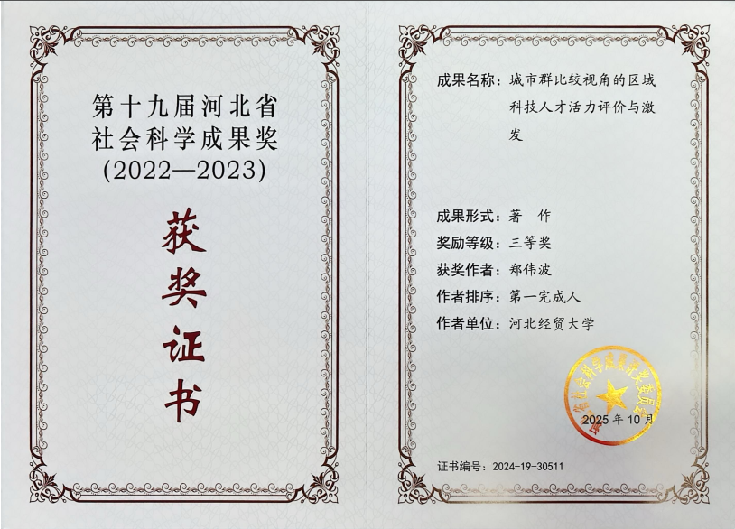 河北省社会科学优秀成果奖是由河北省人民政府授权河北省社会科学院设置,旨在表彰为推动党的创新理论体系化学理化研究、加快构建中国社会科学自主知识体系、服务经济社会高质量发展作出重要贡献的我省优秀成果。该奖项每两年评选一次。经严格评选程序,第十九届河北省社会科学优秀成果奖共评选出奖励成果290项,其中特别奖3项,一等奖35项、二等奖110项、三等奖142项。