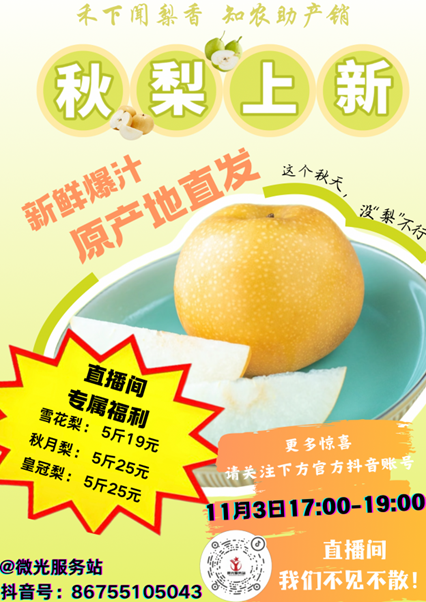 专属福利:经贸学子私信直播间工作人员“经贸自提”,可享额外优惠!无论你是想品尝应季无农残鲜梨,还是想为勤劳农户献出一份力,或是感受志愿服务与青春同行的温度,11月3日下午17:00-19:00,锁定微光服务站抖音直播间!让我们以爱为犁,共赴清甜之约,用行动传递微光,为农户助力,不见不散。