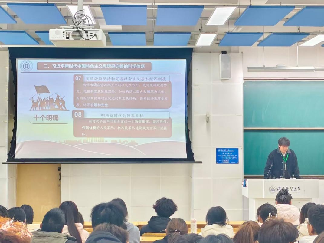 紧接着,团委事务组织中心副部长郑博旭则以习近平新时代中国特色社会主义思想为核心,从时代背景切入,深入解读“十个明确、十四个坚持、十三个方面成就”的核心要义、精神实质与实践要求,引导青年学子把握其中的马克思主义立场、观点与方法,明确新时代青年的责任担当。